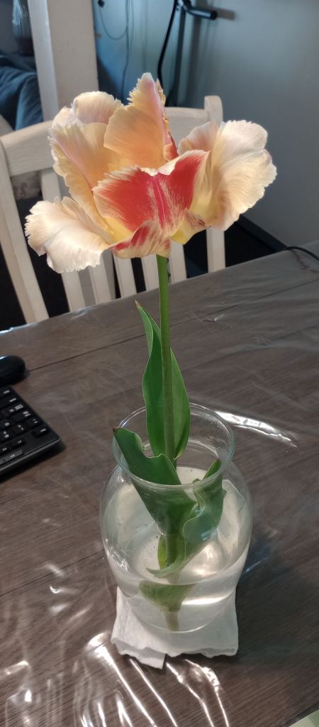 Naturally, I was slightly upset. My wonderful child has a habit of appreciating my plants a little too up-close! So, I placed the tulip in a vase and let it sit on the dining table. Day by day, I watched this single flower bloom, revealing all she was made of.